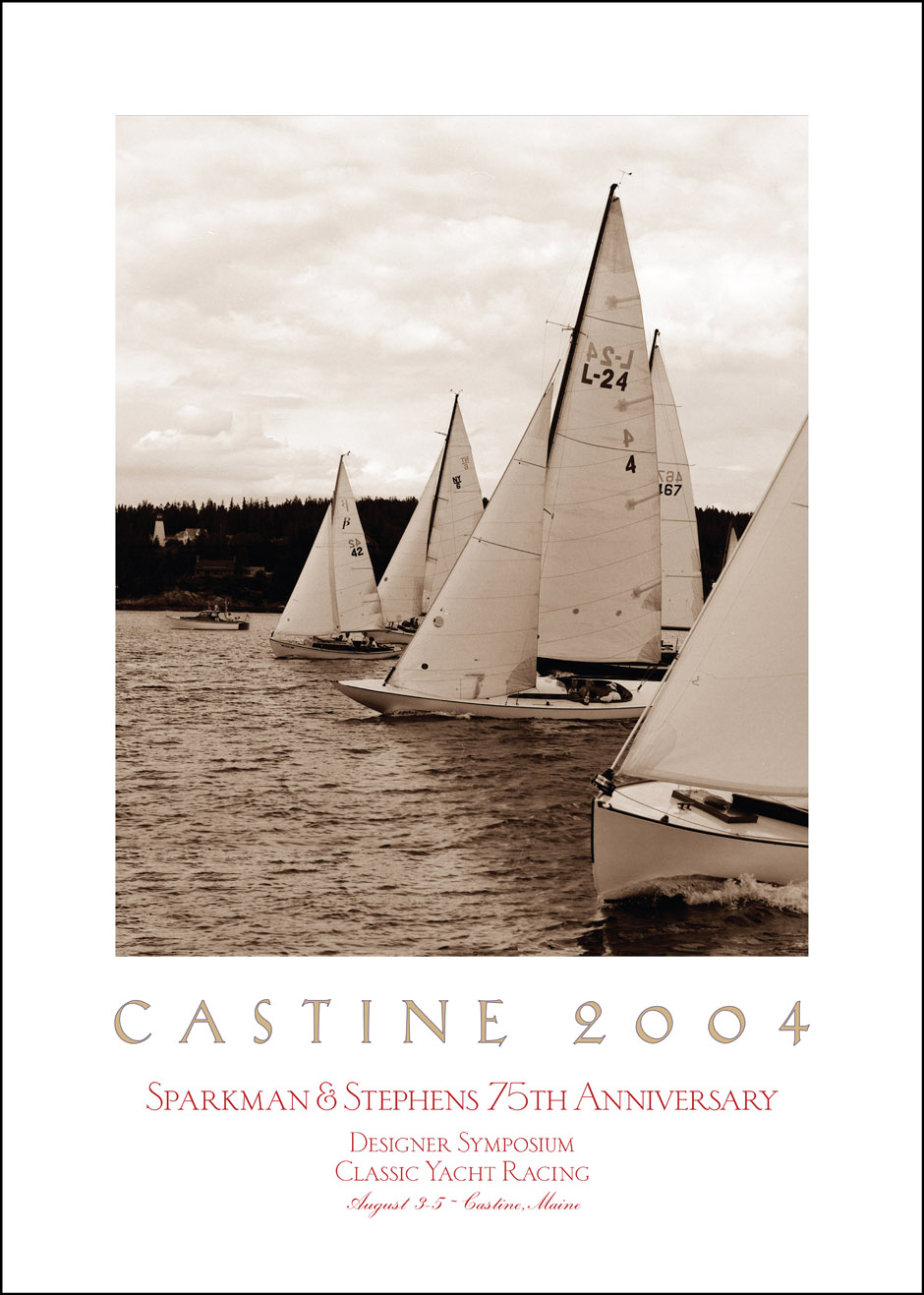 This poster was created for the 75th Anniversary of Sparkman and Stephans yacht designers. It was shot froma chase boat with the Bigshot digital camera back mounted on a Hasselblad 555 ELD medium format camera. It was changed to sepia in Photoshop to unify the image and to give it an historical feel.